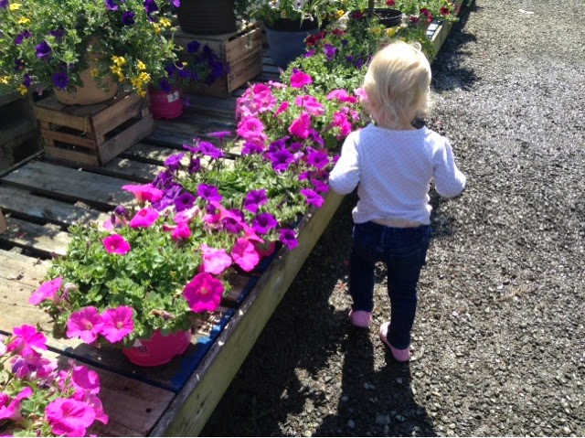 Smelling the flowers..so many pretty ones! She said she liked the red ones best today.